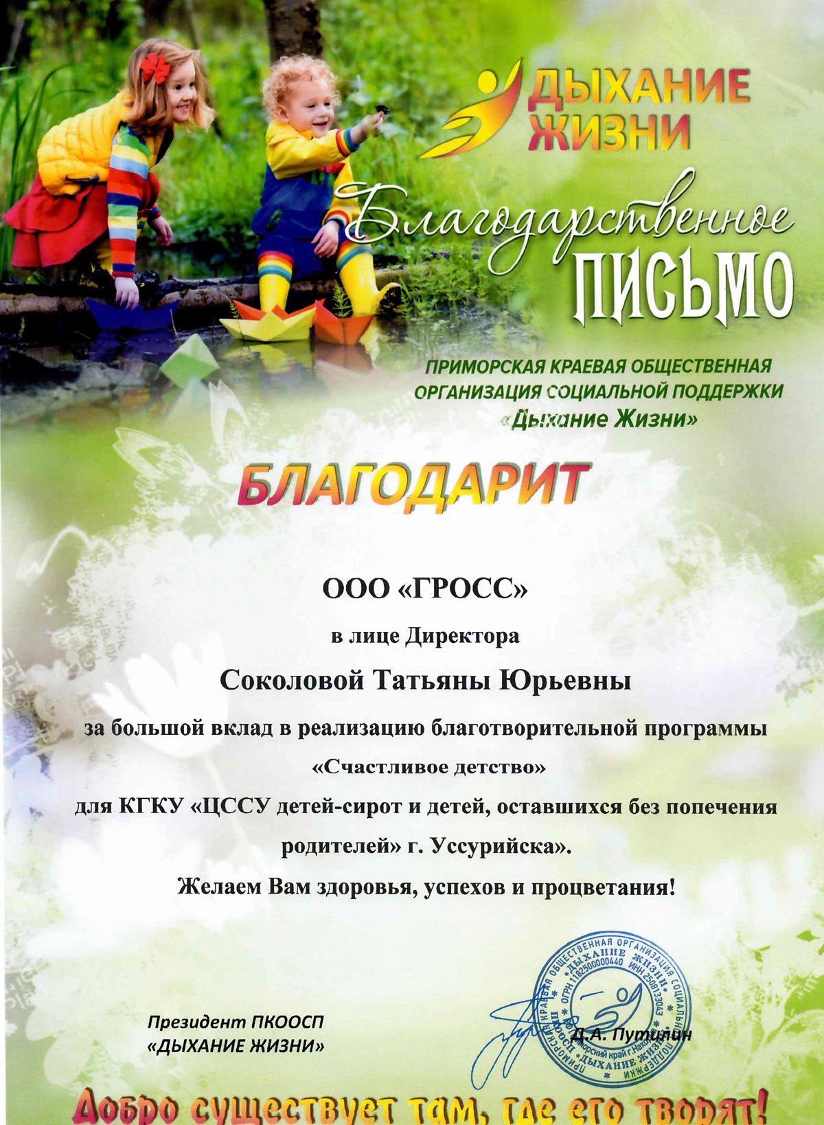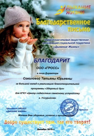 2019г.— Финансовая поддержка реализации благотворительной программы «Здоровый дух», проводимой ПКО Организацией Социальной Поддержки «Дыхание жизни»;