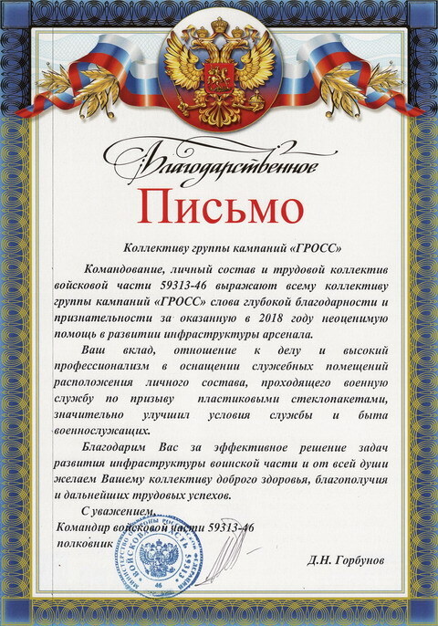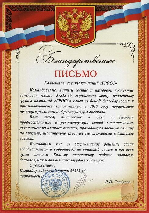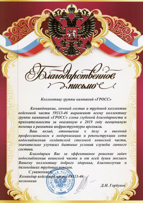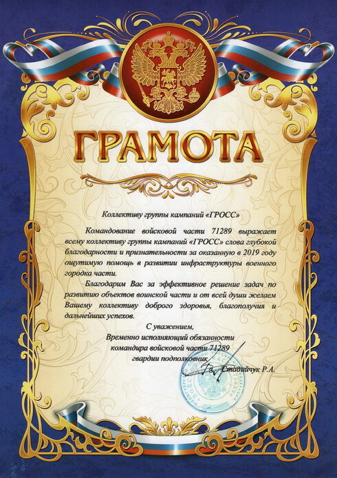 2017-2019гг. — Безвозмездная помощь в восстановлении объектов инфраструктуры на территории Войсковой Части № 59313-46;