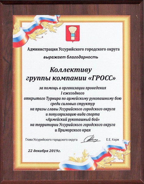 2019г.— Финансовая поддержка организации открытого Турнира по армейскому рукопашному бою среди силовых структур на призы главы Уссурийского городского округа;