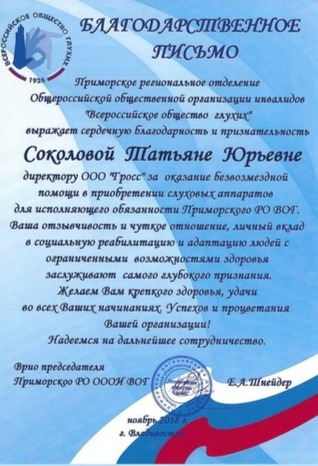 2018г. — Приобретение и поставка партии слуховых аппаратов в дар Приморскому РО ОООИ Всероссийского Общества Глухих;
