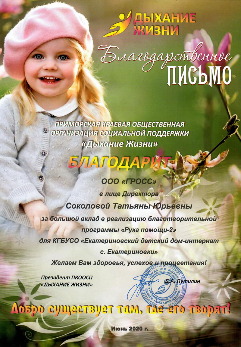2020г.— Финансовая поддержка реализации благотворительной программы «Рука помощи - 2» (приобретение оборудования для лечения и реабилитации детей-инвалидов), проводимой ПКО Организацией Социальной Поддержки «Дыхание жизни».